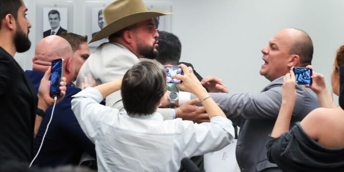 Para além dos bate-bocas e xingamentos durante boa parte da sessão, após arquivamento do caso os deputados André Janones e Nikolas Ferreira (PL/MG) marcaram a briga do lado de fora do plenário. Pelos vídeos que circulam nas redes sociais é possível ver Janones chamando Nikolas para briga “lá fora”.