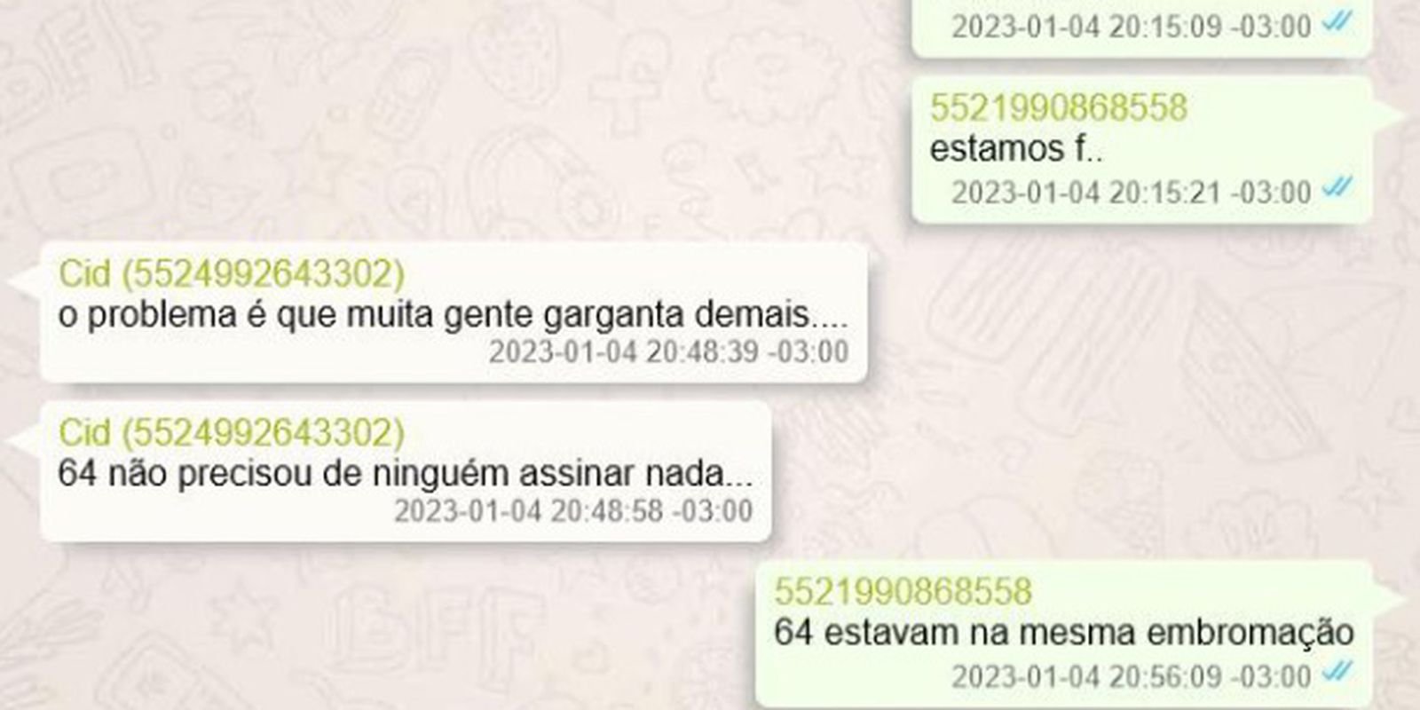 “Fomos covardes, na minha opinião”. Mauro Cid concorda e acrescenta: “Fomos todos. Do PR e os Cmt F”, abreviações que, conforme a PF, se referem ao então presidente da República, Jair Bolsonaro, e aos Comandantes das Forças Armadas. Cavaliere replica: “PR também”, “estamos f…”.