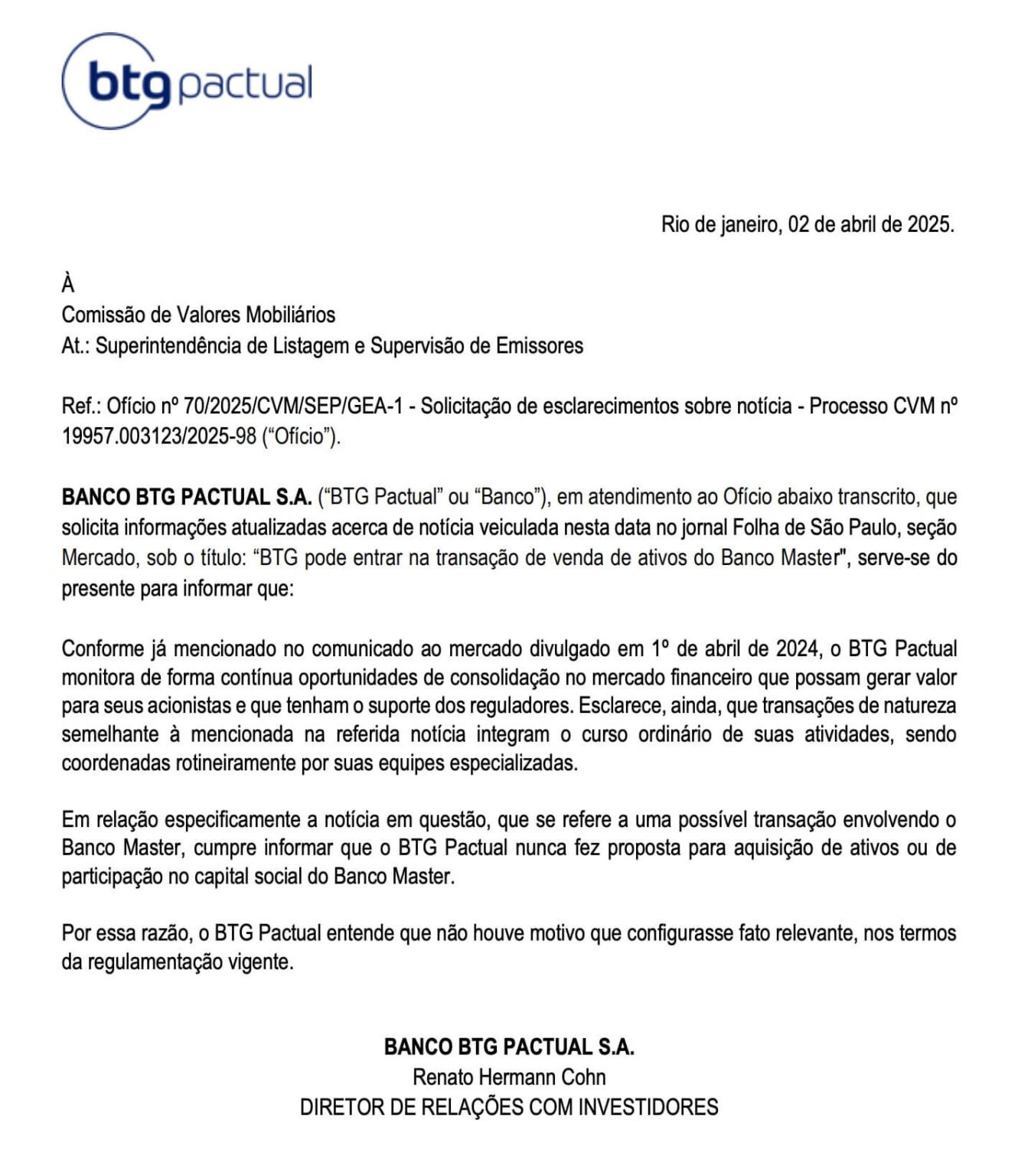 A desmentida do BTG Pactual ocorre em resposta a rumores de que a instituição teria feito uma oferta simbólica de R$ 1 pelo controle do Banco Master. No comunicado, assinado por Renato Cohn, diretor de relações com investidores, o banco afirmou que “nunca fez proposta para aquisição de ativos ou participação no capital social do Banco Master”. O texto também enfatiza que o BTG Pactual segue atento a oportunidades de consolidação no setor financeiro, mas que qualquer movimentação passa por uma análise rigorosa em termos regulatórios e estratégicos.