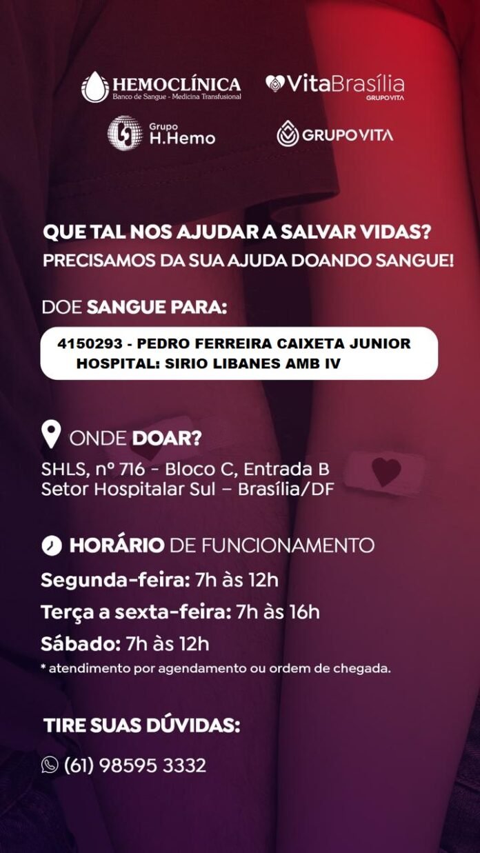 A Polícia Militar do Distrito Federal faz um apelo urgente à comunidade: O senhor Pedro Ferreira Caixeta Junior está enfrentando uma batalha difícil e precisa de sua ajuda. Pedro necessita de doações de sangue para continuar seu tratamento.