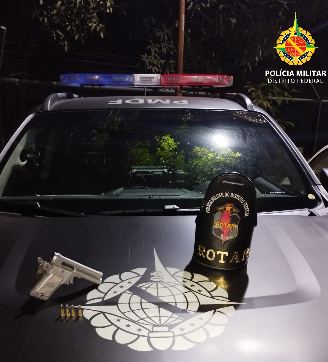 Ambos foram abordados e dentro do veículo os policiais encontraram quatro munições calibre 22 e alguns apetrechos para o uso de substância entorpecente. Um deles assumiu a propriedade dos objetos e no matagal que o suspeito estava a equipe da Rotam encontrou uma pistola calibre 22.
