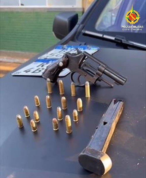 Em patrulhamento na região, os policiais receberam informações a respeito de um homem armado no conjunto E da quadra 12. Chegando ao endereço, o proprietário do imóvel relatou possuir uma arma de fogo para se proteger de vários inimigos que moram na região. Um revólver calibre .38 com 16 munições intactas e um carregador de pistola 9mm foram apreendidos.