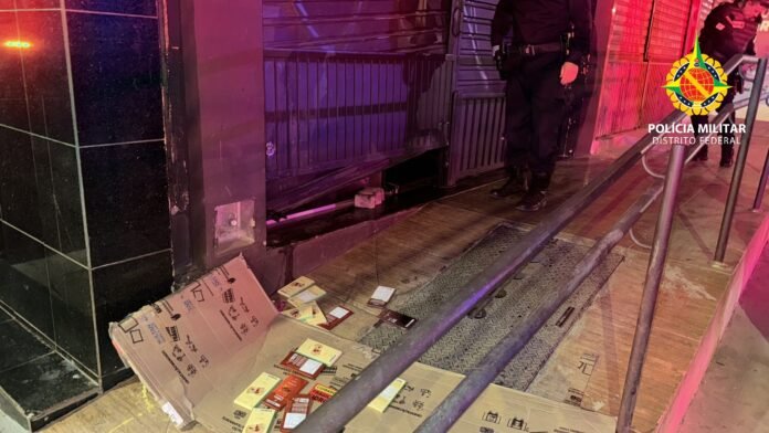 Os policiais observaram o indivíduo no momento em que ele estava retirando os produtos da loja, que apresentava sinais de arrombamento, incluindo grades e vidros danificados. Ao ser verbalmente instruído a sair do estabelecimento, o suspeito tentou fugir, mas foi rapidamente contido pela equipe policial.