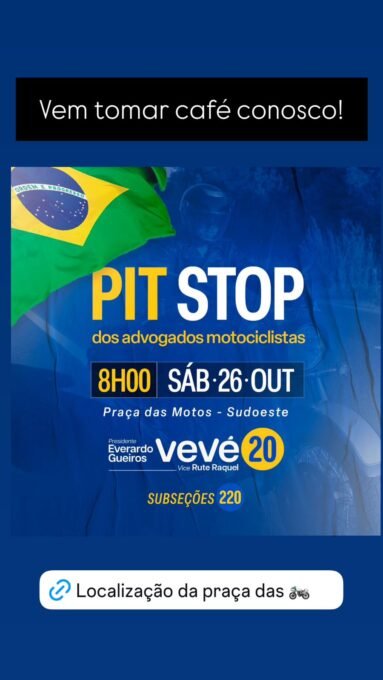 O Grupo de Advogados Motociclistas está organizando um adesivaço em apoio à candidatura 20 – CORAGEM PARA MUDAR, liderada por Everardo Gueiros (presidente) e Rute Raquel (vice-presidente). O evento acontecerá na Praça das Motos, localizada no Sudoeste.