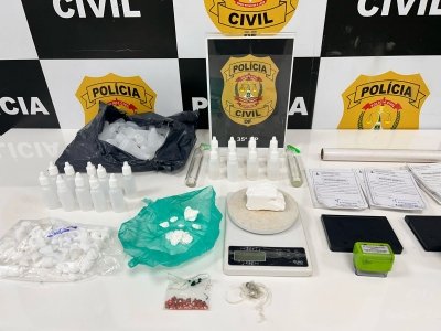 No interior de uma residência foram apreendidos frascos contendo loló, tubos de lança-perfume, balança digital, maconha e MDMA. Foram localizados, também, frascos vazios para acondicionar loló, carimbos com nome e CRM de médicos, além de atestados médicos avulsos e alguns já carimbados.