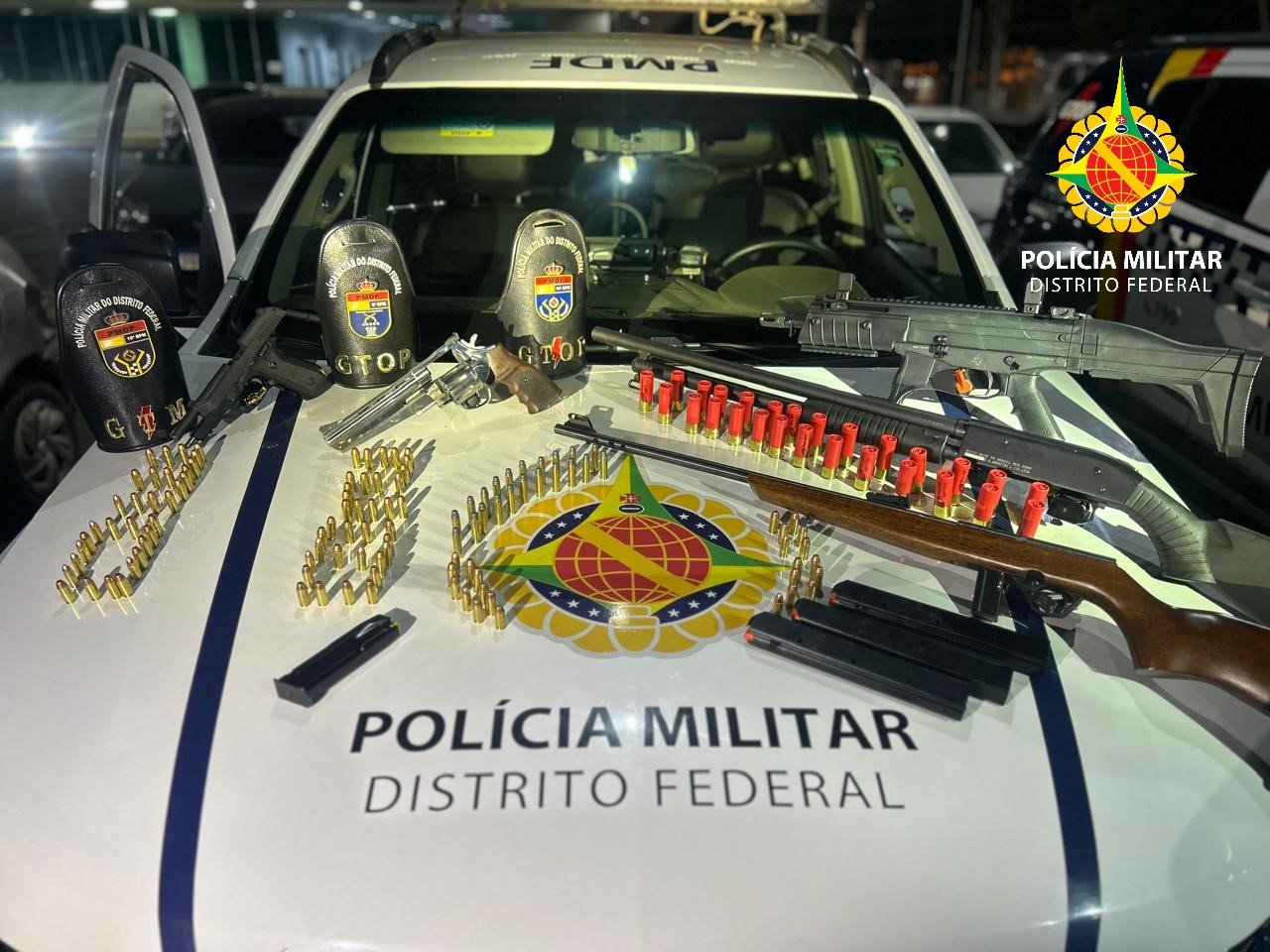 A Polícia Militar do Distrito Federal realizou uma prisão de cinco armas de fogo e 235 munições em um Condomínio na Ceilândia, que resultou na prisão de um homem pelos crimes de posse irregular de arma de fogo, ameaça e disparo em via pública.