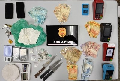 Durante a operação, foram apreendidas grandes quantidades de substâncias ilícitas, incluindo duas porções médias de cocaína, diversas porções fracionadas de maconha e cocaína, além de uma balança de precisão, máquinas de cartão de crédito e aproximadamente R$ 4.800 em dinheiro.