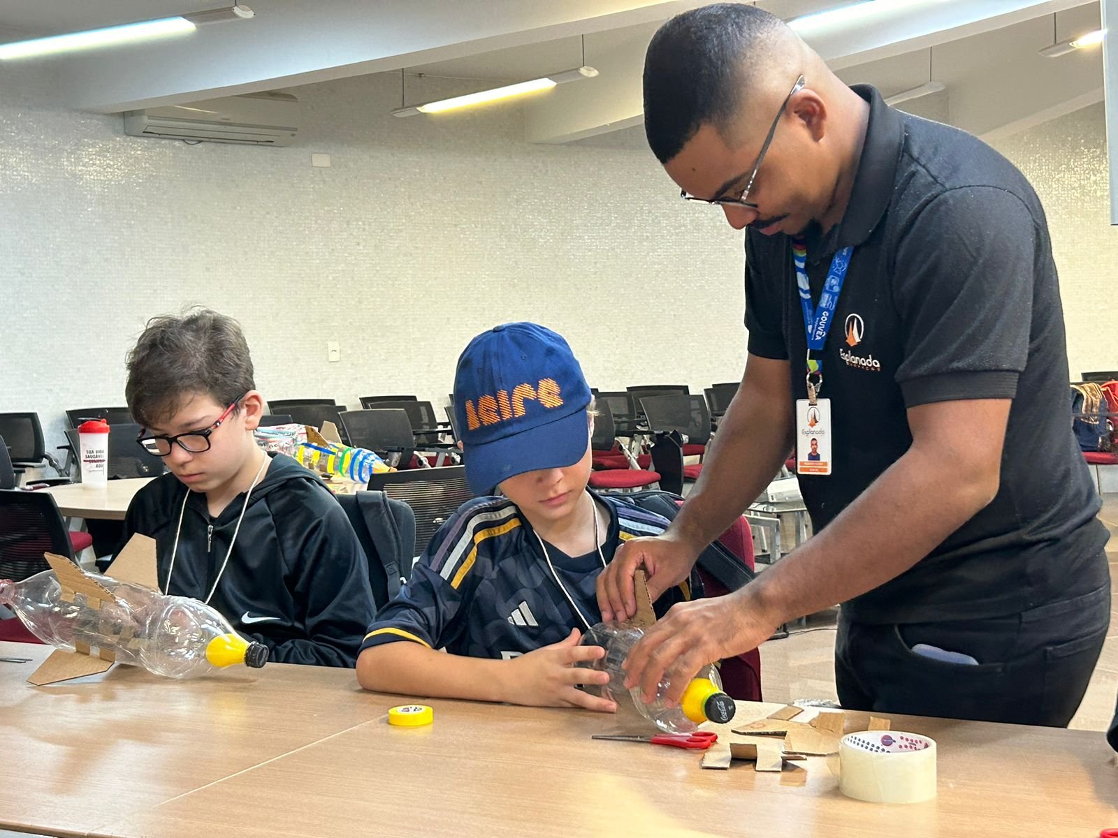 Os participantes de 9 a 12 anos aprenderam a montar e lançar um foguete feito com garrafa pet | Fotos: Divulgação/ Secti-DF