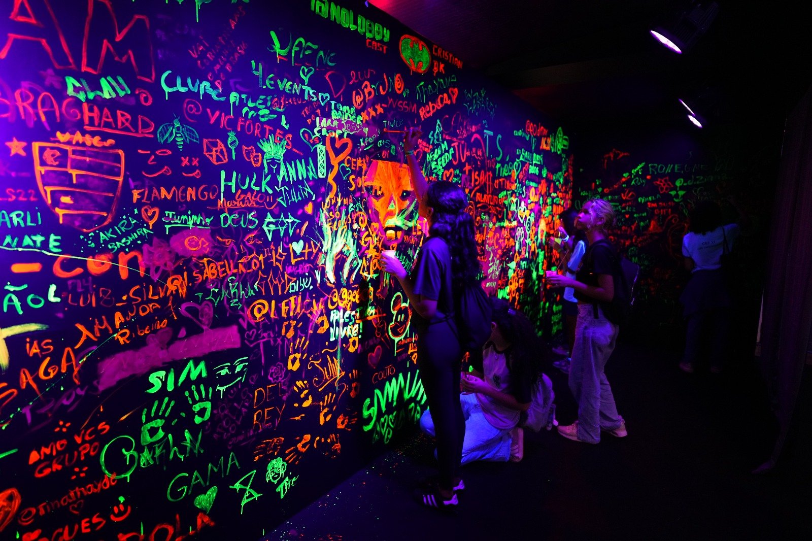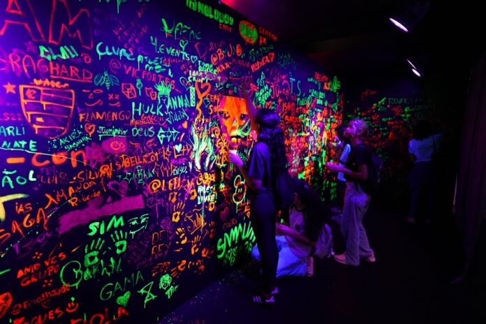 ⇒ Neon Space, espaço onde os visitantes poderão desenhar, escrever e pintar usando tintas fluorescentes que em ambiente com luz negra, deixa o espaço super instagramável. O artista e professor de ilustração, que também estuda e aplica em seu trabalho essa técnica utilizada no espaço vai ensinar como fazer.