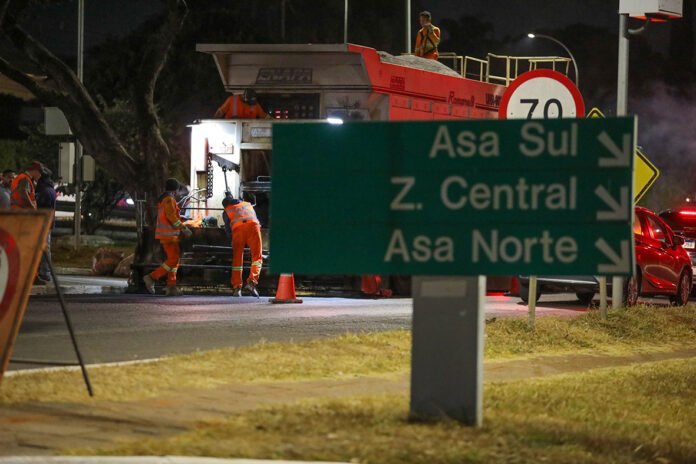 O DER-DF tem realizado os serviços em uma força-tarefa, no período noturno, das 21h às 6h, em uma faixa por vez, para que todos eles sejam concluídos ainda no período da seca realizados | Foto: Joel Rodrigues/Agência Brasília