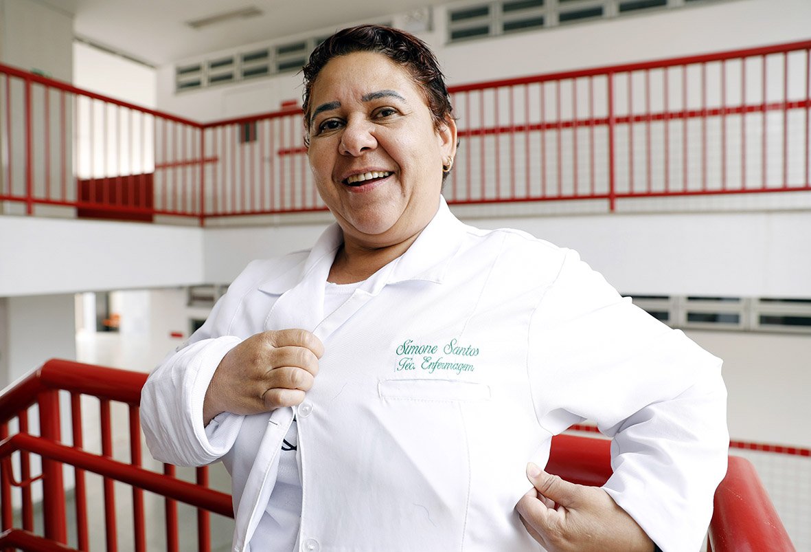 “O voo não pode ser ensinado, só pode ser encorajado”. As palavras de Rubem Alves, na entrada da Escola Técnica Deputado Juarezão, em Brazlândia, ganharam mais significado para a estudante Simone Santos, 49 anos, depois de tantas lutas para conquistar na unidade seu certificado como técnica de enfermagem. Foram mais de 10 anos até ela se encorajar a dar o primeiro passo rumo à profissão que sempre sonhou. “Trabalhei a vida toda como cozinheira, mas sempre quis atuar na área da saúde. Com o apoio da equipe pedagógica, a escola me deu a oportunidade de me realizar profissionalmente”, compartilha a profissional, com orgulho.