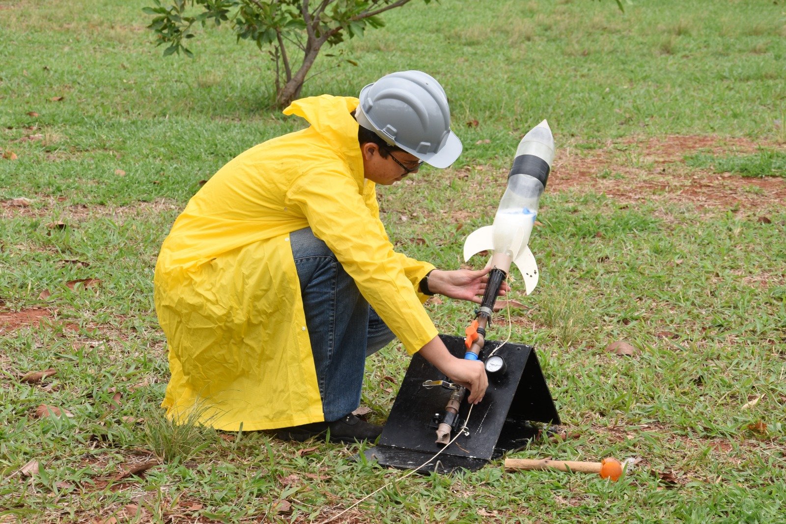 Construído a partir de garrafas pet, o foguete usa propelentes à base de bicarbonato de sódio e vinagre para conseguir o impulso necessário para ser lançado