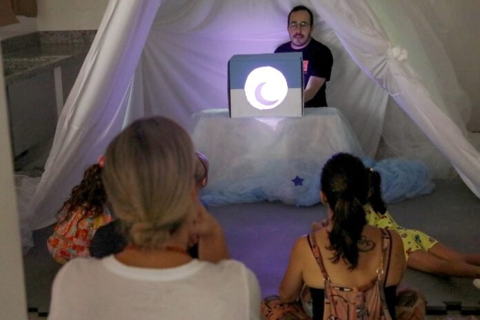 Na manhã deste domingo (9), pais e crianças acompanharam uma apresentação de teatro de luz e sombra. “A gente tem um contato muito grande com a arte, eu gosto muito de arte, essa é minha área de estudo, de pesquisa, e na escola ela está vendo sombras e luz agora nesse início de ano. Aí a gente achou que seria uma oportunidade de juntar as duas coisas: a arte, que é uma coisa muito importante para a nossa família, e o que ela está estudando na escola”, contou a psicóloga Aline Farias, que levou a filha, Cora Linda, de 5 anos, para a apresentação. “Concretiza o que ela está aprendendo, traz de uma forma prática para ela introjetar isso no conhecimento e não esquecer mais”, emendou o pai, o servidor público Saulo Pereira.