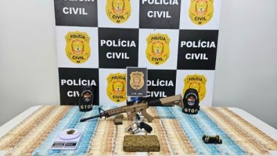 Na sequência, a equipe policial deslocou-se até a residência de um dos envolvidos. No local, após buscas, foram apreendidos uma porção adicional da mesma substância entorpecente, uma arma de fogo, um simulacro de fuzil, a quantia de R$ 15.000,00 (quinze mil reais) em espécie, uma balança de precisão e um simulacro de fuzil.