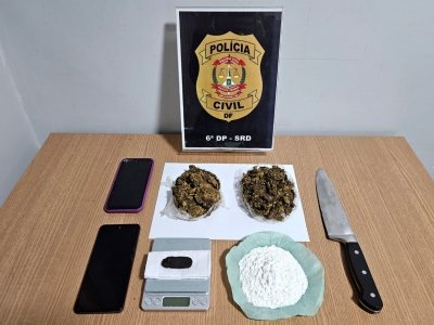 Durante a abordagem, foi encontrada porção de haxixe em posse do autor. Em continuidade às diligências, a equipe policial deslocou-se até a residência do investigado, onde, após buscas, foram localizadas outras porções de skunk e cocaína, bem como uma balança de precisão utilizada para o fracionamento e posterior comercialização das drogas. Na mesma ocasião, foi apreendido o aparelho celular do autor, utilizado para intermediar a comercialização dos entorpecentes.