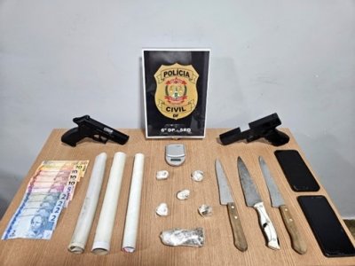 Ao se aproximarem para realizar a abordagem, os usuários fugiram e o traficante correu para dentro da residência. Os policiais o acompanharam e o flagraram tentando se desfazer de porções de cocaína na pia do banheiro. No quarto ao lado, foi localizado um simulacro de arma de fogo sobre a cômoda.