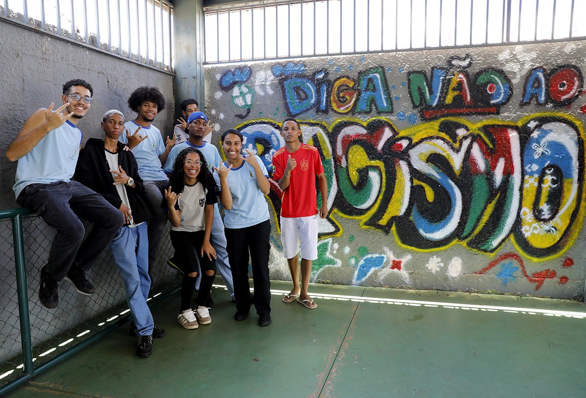 Coordenador da oficina de dança na escola, o estudante Marcos Vinícios Gomes, 18,  conta que é possível falar sobre antirracismo por meio da arte. “Por meio da dança, que é uma arte muito energética, nós conseguimos levar esse tipo de cultura. Muitas vezes as pessoas não têm muita paciência para ouvir palestras, mas quando você coloca uma dança, quando você coloca uma música que as pessoas gostam, elas prestam mais atenção. É uma das várias formas de manifestar esse conhecimento”, observa.