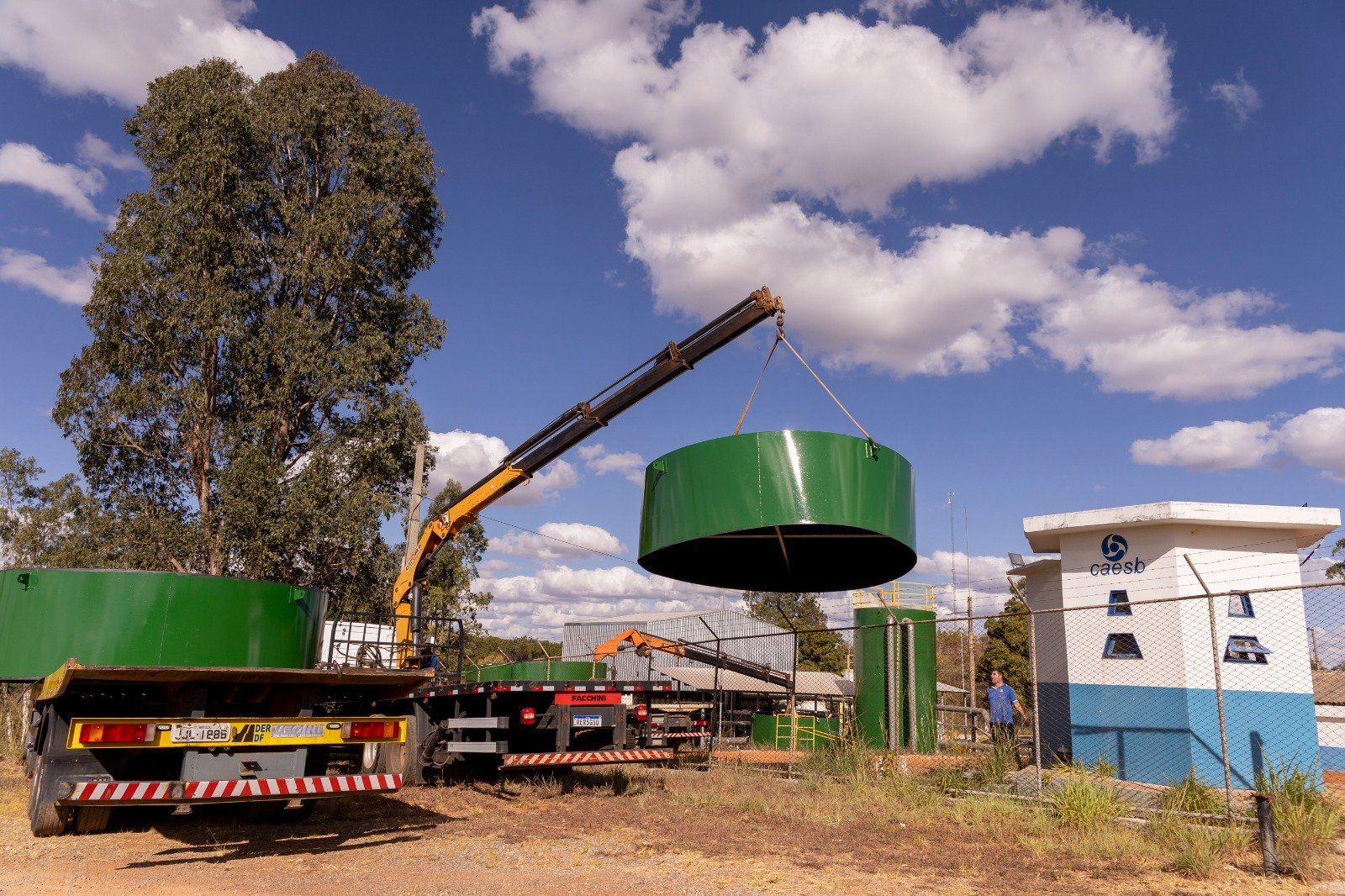 A ETA Planaltina, até o início deste ano, contava com dois reservatórios feitos de fibra de vidro que armazenavam água bruta para ser tratada e distribuída. Para melhorar a segurança operacional e modernizar a estação, a Caesb resolveu trocá-los por reservatórios metálicos, feitos de aço carbono.