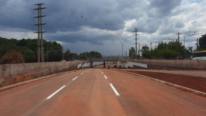 Até que as obras sejam totalmente concluídas, o trânsito ora fluirá pela parte de baixo do complexo, ora se dará pela parte de cima. A empresa contratada está trabalhando, neste momento, na colocação de meios-fios, plantio de grama, instalação de bocas de lobo, realização de sinalização horizontal e vertical, além de recapeamento do pavimento asfáltico nas imediações da obra.