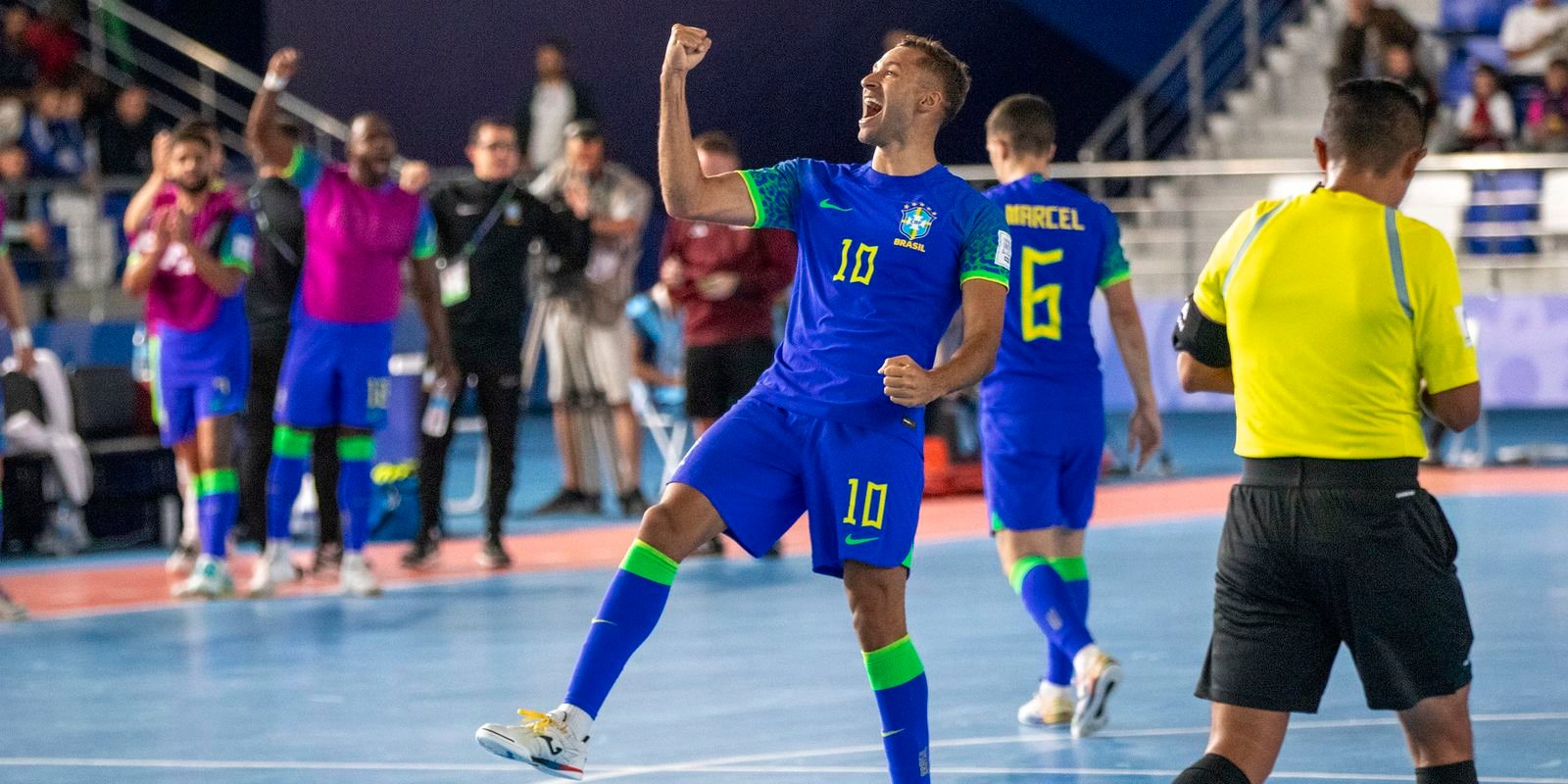 O Brasil goleou a Croácia por 8 a 1, nesta terça-feira (17) no Uzbequistão, e garantiu, de forma antecipada, a classificação para as oitavas de final da Copa do Mundo de futsal. O triunfo da equipe comandada pelo técnico Marquinhos Xavier foi construído com gols de Pito (dois), Marcel (dois), Dyego, Neguinho, Arthur e Rafa.