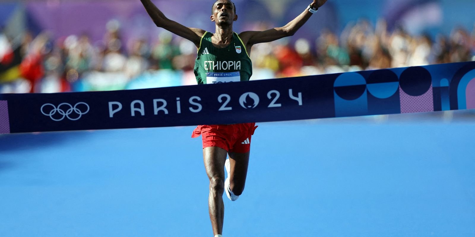 A prova da maratona olímpica (42 quilômetros) tem novo rei e novo recordista. Na madrugada deste sábado (10), manhã em Paris, o etíope Tamirat Tola conquistou o ouro com o tempo de 2h06min26s, superando o antigo recorde da prova em Olimpíadas, registrado pelo queniano Samuel Kamal Wanjiru, em Pequim-2008 (2h06min32s). Completaram o pódio o belga Bashir Abdi, que ficou com a prata e o queniano Benson Kipruto, bronze.