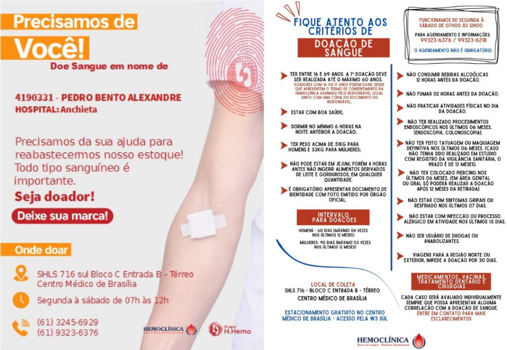 Em um simples gesto, mas significativo, a Polícia Militar do Distrito Federal convida você a participar de uma jornada de compaixão e esperança.Cada doação de sangue contribui diretamente para o tratamento do Sr. Pedro Bento, pai do 2º Ten Roberto do DEC, que está internado no Hospital Anchieta em Taguatinga.Juntos, podemos salvar vidas.Local para doação: SHLS 716 sul, bloco C, Entrada B – Térreo – Centro Médico de Brasília.Horário de funcionamento: Segunda a sábado 07h às 12hContato: (61) 3245-6929 ou (61) 9323-6376